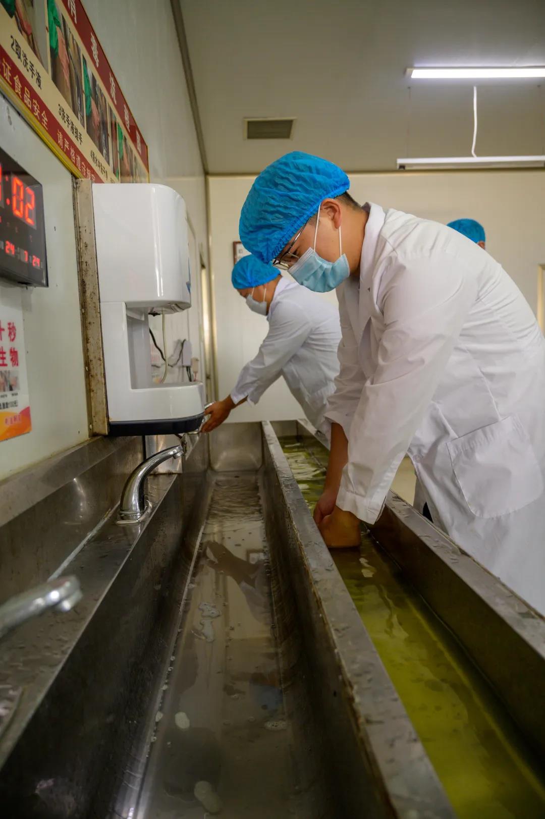 嚴格遵守源氏食品相關規定,全副武裝、洗手消毒、360度風淋除塵之后進入生產車間
